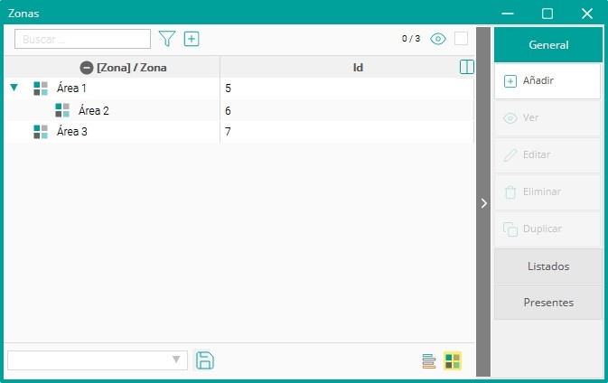 La zona Exterior está predefinida, aunque se puede cambiar el nombre, y a partir de ella se debe construir el árbol de zonas. Así, siguiendo el ejemplo se debe crear la zona Área 1, seleccionando Añadir: