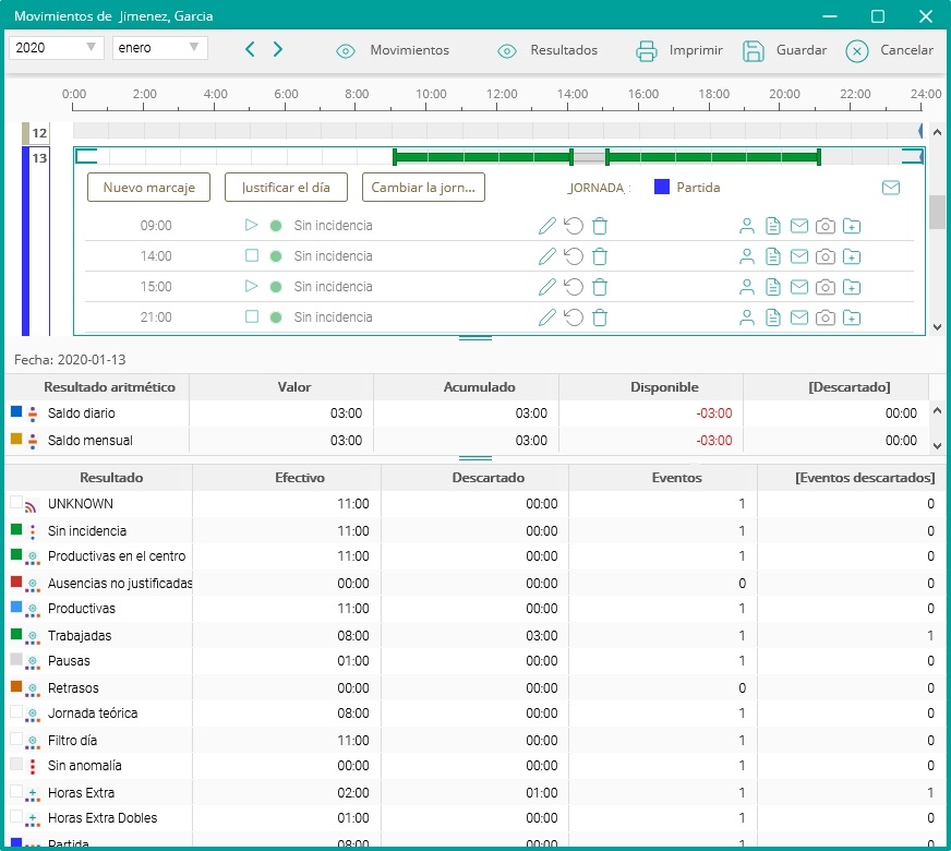 Otro punto a tener en cuenta, es que si se crean cálculos con el mismo nombre en distintas jornadas, el sistema los considera como el mismo tipo de tiempo, y los presenta agrupados en consulta de resultados.